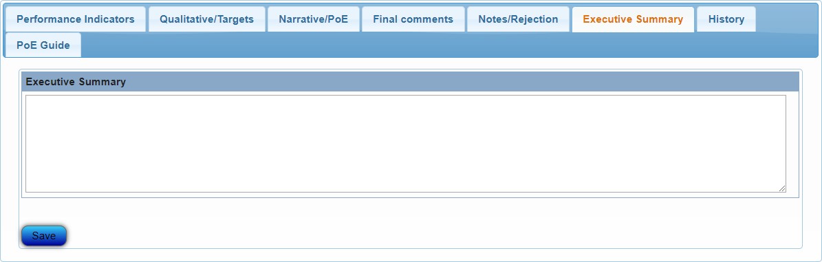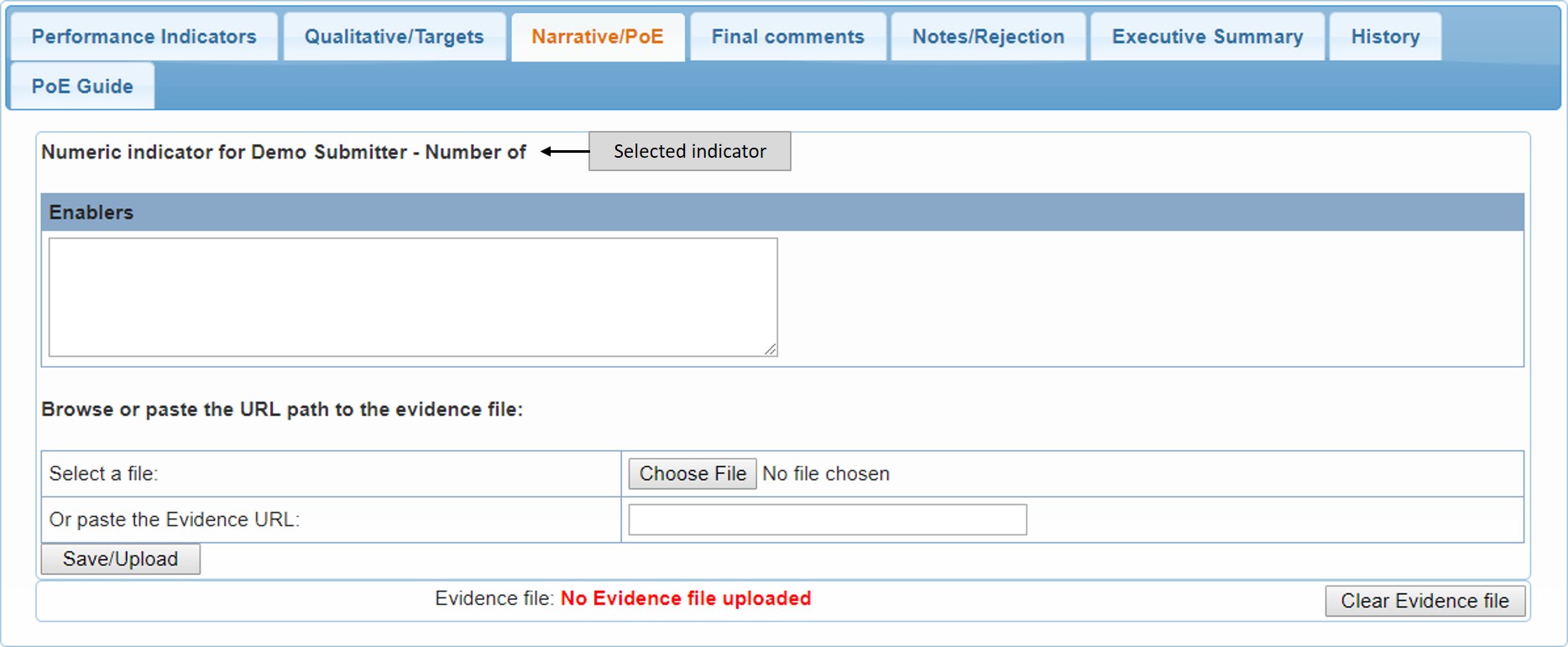 When the target is over achieved, the system automatically opens the Narrative/PoE tab immediately after you save the Numeric Actual in the Performance Indicators tab, as displayed above. Just below the selected indicator description is the Enablers text box. Here you must explain how or why the target was over achieved.