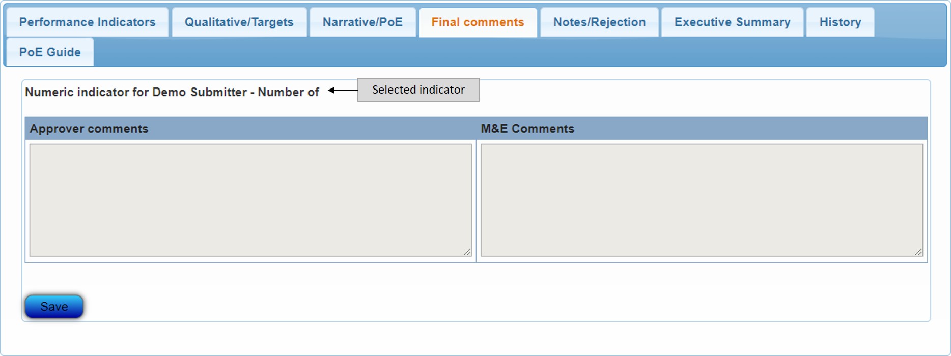 The Final Comments tab is where the Approver and the M&E team put in their final comments, if any, regarding the selected indicator. At the Approver workflow, only the Approver Comments text tab is enabled, and at the M&E Approval workflow stage only the M&E Comments text box is enabled, for the respective users to provide their input.