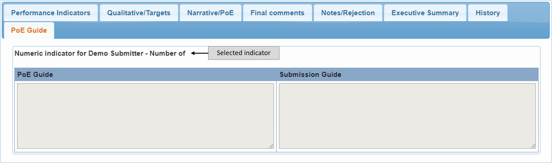 As displayed in the image above, the PoE Guide tab contains two read-only text boxes, the PoE Guide text box and the Submission Guide text box