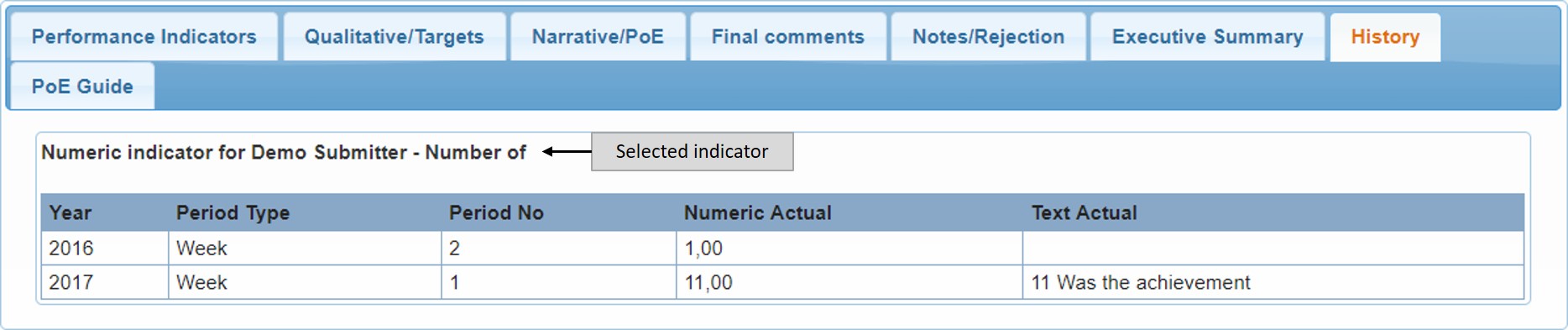 As displayed by the image above, the History tab displays all of the selected indicator's performance history, up to what was captured in the current reporting period.