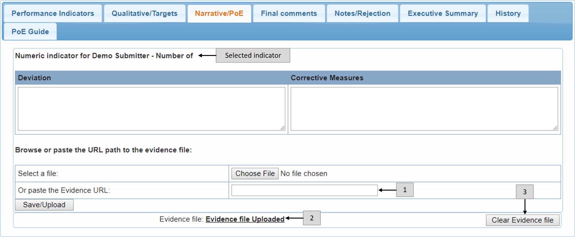 When the target is not achieved, the system automatically opens the Narrative/PoE tab immediately after you save the Numeric Actual in the Performance Indicators tab, as displayed above. Just below the selected indicator description are the Deviation and the Corrective Measures text boxes. In the Deviation text box you must explain how or why the target was not achieved. In the Corrective Measures text box you must supply the suggested corrective measures to improve the performance results.
