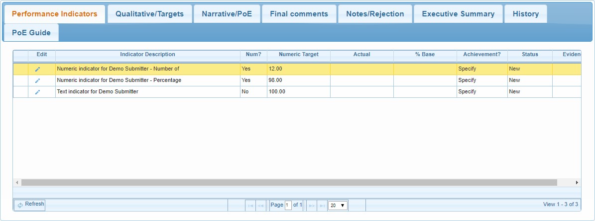 For an indicator whose Numeric Actual is equal to the Numeric Target, i.e., just achieved, it is optional to explain why or how the target was achieved, and therefore the system does not automatically open the Narrative/PoE tab after you have saved the Numeric Actual. You must then open the tab yourself to supply the explanation.