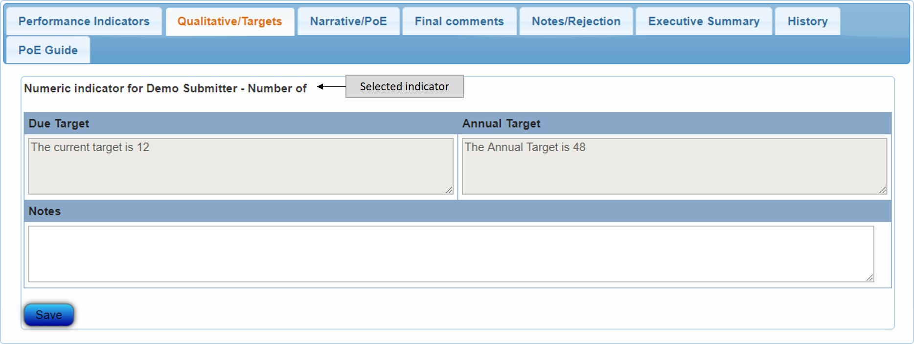 The Due Target text box is a read only text box that displays the text target for the current reporting period for the selected indicator.