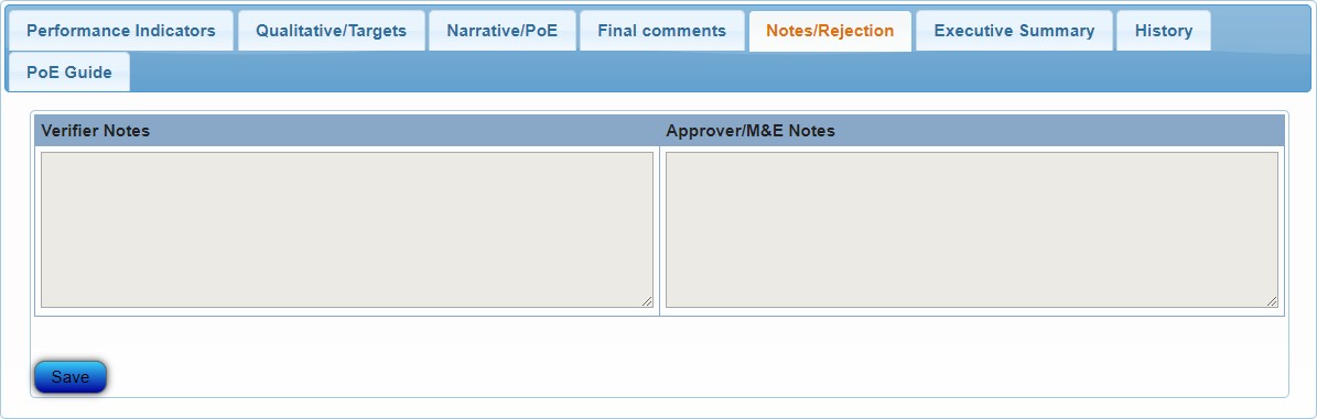 The Notes/Rejection tab is where the Verifier and the Approver put in their rejection reasons when they reject a report. At the Verification workflow stage, the Verifier Notes text box is enabled, and the Approver/M&E Notes text box is disabled and grayed out, and it's vice versa at the Approver and the M&E workflow stages.