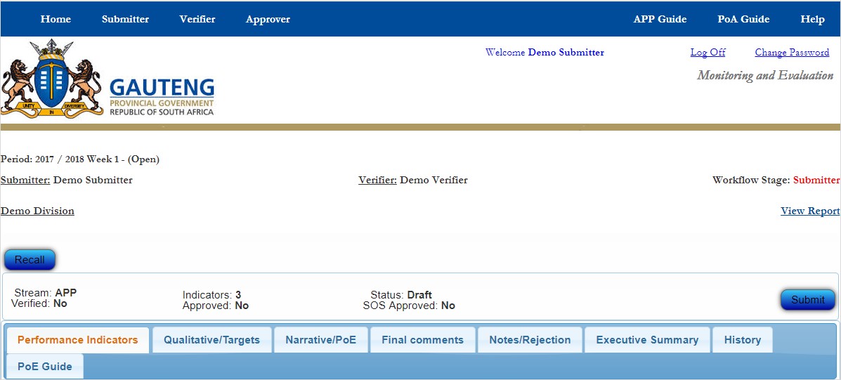 When the Verifier or Approver rejects one or more indicators in the Performance Indicators tab, the system will not allow them to submit without supplying the rejection reason(s) in the Notes/Rejection tab.
