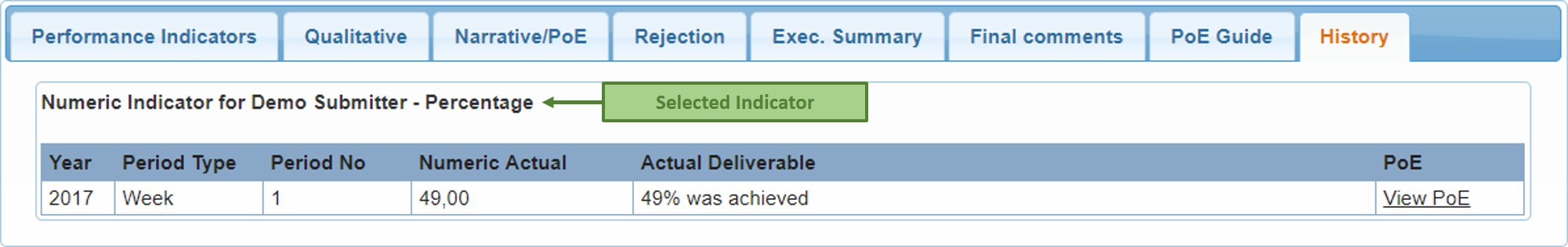 The History tab also contains the link that opens the Evidence File that was uploaded for the selected indicator - "View PoE".